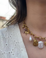 O Charmy é um colar dourado com elos largos e pendentes inspirados no mar: búzios, conchas, flores, corações e pérolas irregulares — tudo o que nos lembra dias de sol, pés descalços e liberdade.