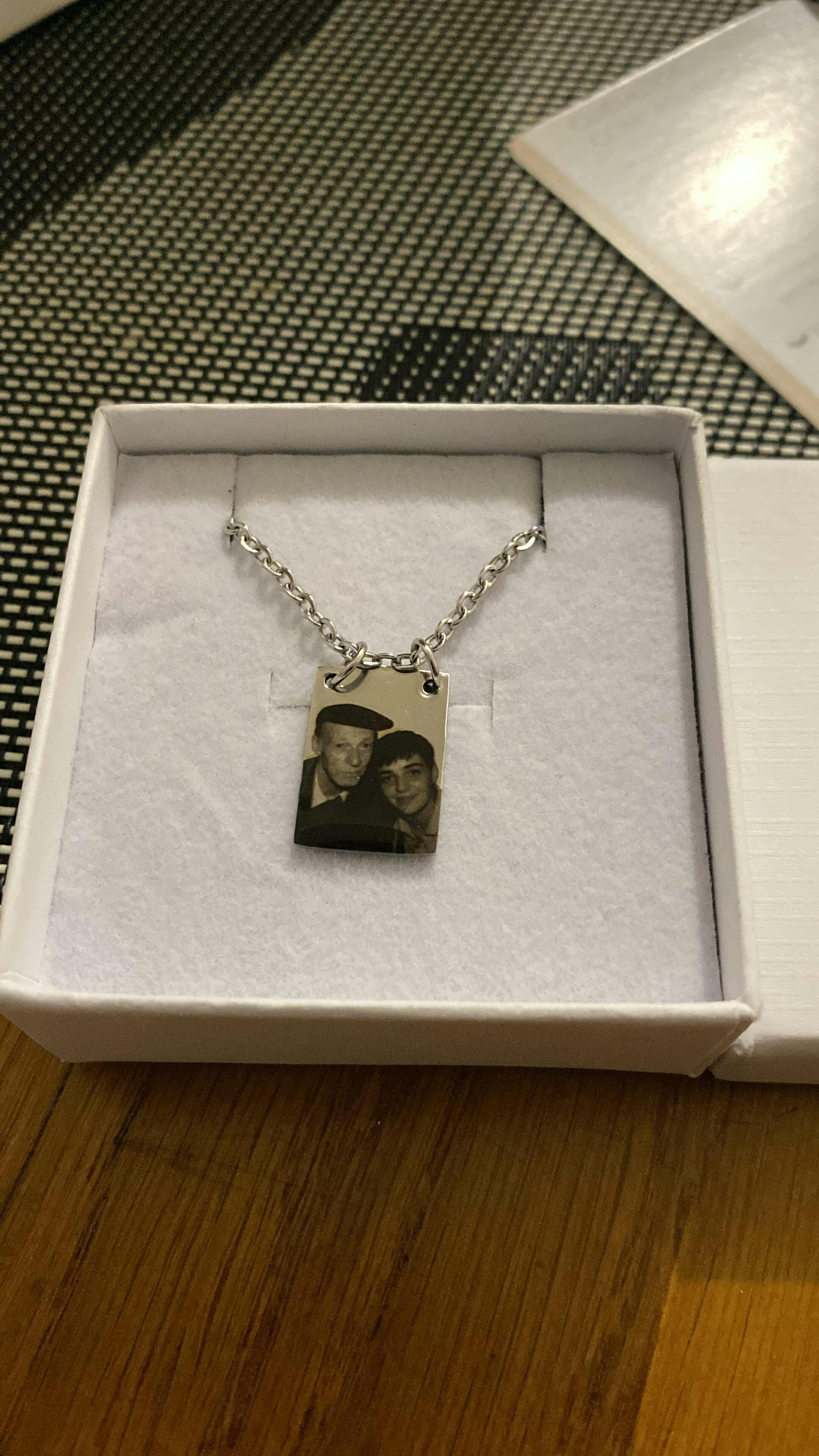 O Colar Personalizado Retangular é uma peça pensada para guardar memórias — através da gravação a laser de uma fotografia, uma frase com significado ou até a caligrafia de alguém especial.