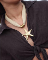 O Colar Star Queen não passa despercebido. A fita larga envolve o pescoço como uma peça de alta-costura, enquanto a estrela dourada no centro rouba todas as atenções. É intenso, ousado e dramático e é o detalhe que define todo o outfit. A energia de verão, a força do oceano e um toque de realeza misturam-se numa peça única.
